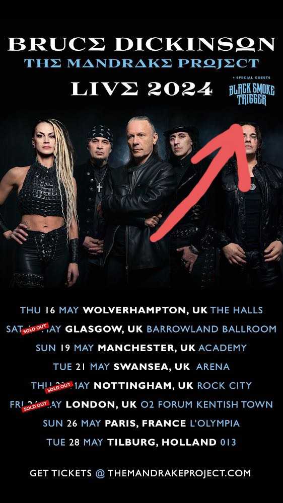Oggi i Black Smoke Trigger hanno dato un grande annuncio. Apriranno i concerti di Bruce Dickinson in Francia, Regno Unito e Olanda. Il grande cantante degli Iron Maiden sta per pubblicare un nuovo album da solista, The Mandrake Project, che uscirà il primo Marzo 2024, e in alcune tappe del suo tour mondiale i concerti saranno aperti proprio dai BST! Per acquistare i biglietti questo è il LINK, sperando che presto i 4 suonino anche in Italia!